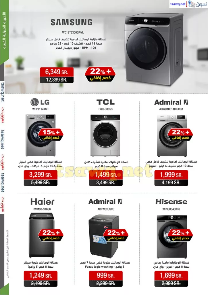 - غسالة أوتوماتيك سامسونج: 6349 ريال سعودي، سعة 18 كجم، 22 برنامجًا.