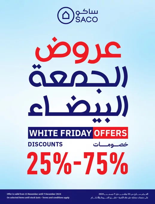عروض الجمعة البيضاء في عروض ساكو السعودية حتي السبت 7-12-2024 تقدم تشكيلة واسعة من الأجهزة الكهربائية و العدد اليدوية والإكسسوارات المنزلية بأسعار تنافسية وتخفيضات هائلة تصل إلى 60% و تشمل العروض أبرز العلامات التجارية المشهورة وتقدم خيارات متعددة تناسب مختلف الاحتياجات المنزلية والشخصية.