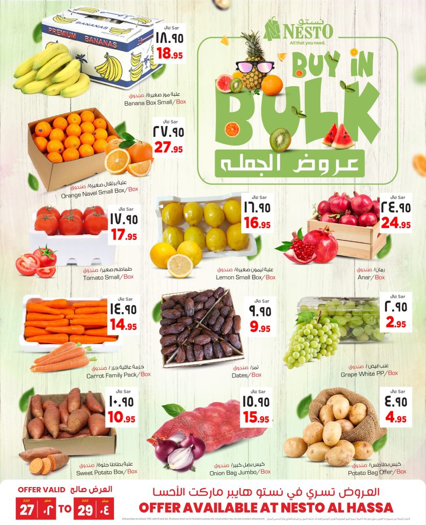 نستعرض معكم احدث عروض نستو الاحساء بتاريخ الاحد 27 يوليو 2025 و تشمل تشكيلة من الخضروات الطازجة منها الطماطم و البصل و البطاطا بجانب الفواكه الشهية من العنب الابيض و الرمان وغيرها من المنتجات و باقل الاسعار ابقوا علي تواصل معنا علي موقعكم عروض توداي ليصلكم كل جديد