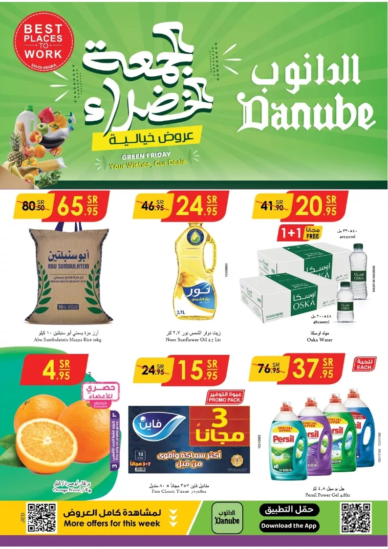 عروض الدانوب جدة تقدم لكم مجموعة مميزة من المنتجات الغذائية والمستلزمات المنزلية بأسعار لا تصدق بمناسبة الجمعة الخضراء تمتعوا بأفضل العروض على المنتجات الطازجة مثل الخضروات والفواكه المستوردة بجودة عالية لتلبية كافة احتياجاتكم اليومية و العروض تشمل أيضاً تخفيضات ضخمة على الأجبان المستوردة ومنتجات الألبان