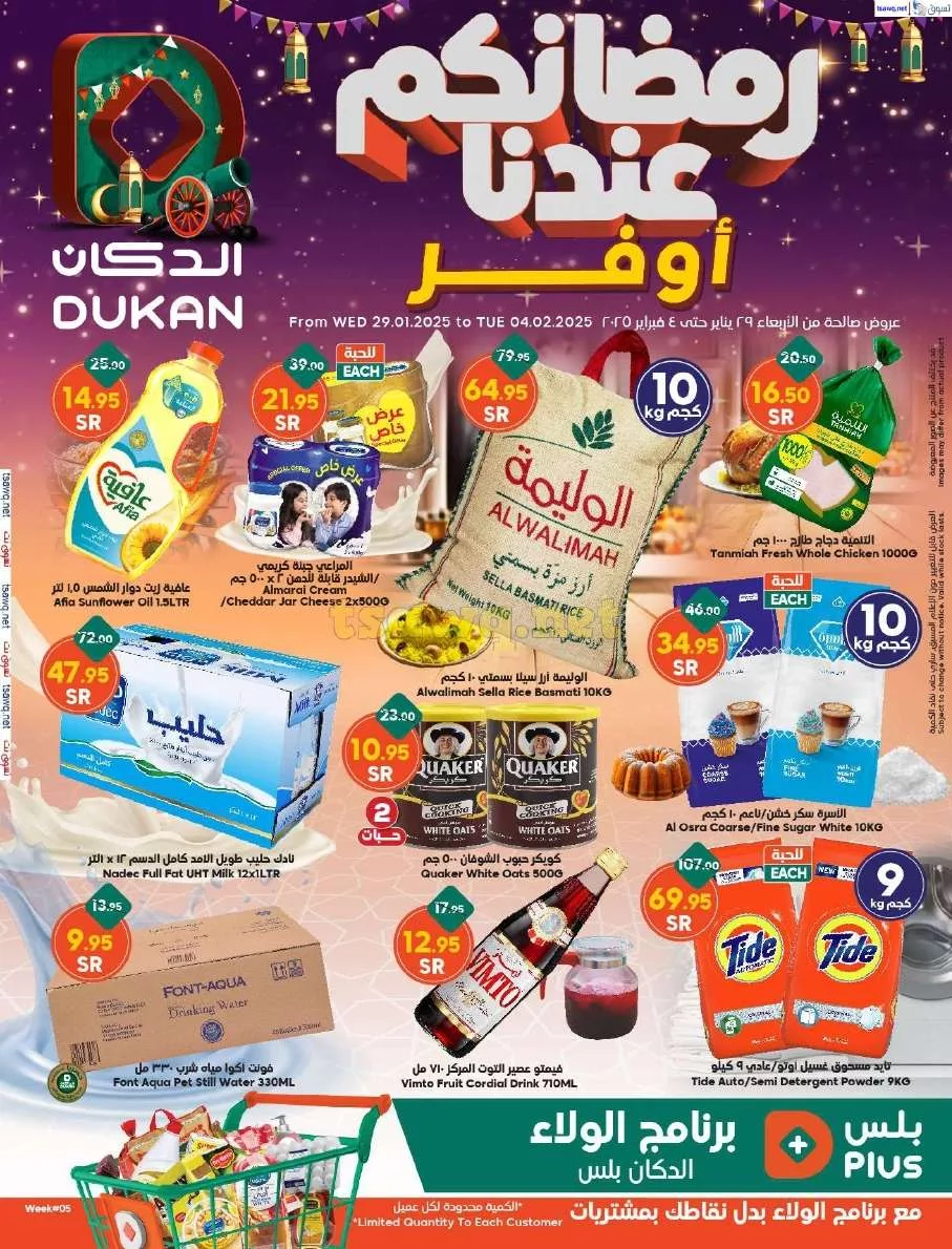 عروض الدكان جدة الأسبوعية الأربعاء 29 يناير 2025 تقدم لك أقوى العروض على المنتجات الغذائية والمستلزمات المنزلية حيث تشمل التخفيضات الزيوت الصحية و الحبوب الغذائية والمعلبات المتنوعة كما تتوفر خصومات على اللحوم الطازجة و الدواجن المجمدة والمأكولات البحرية الطازجة