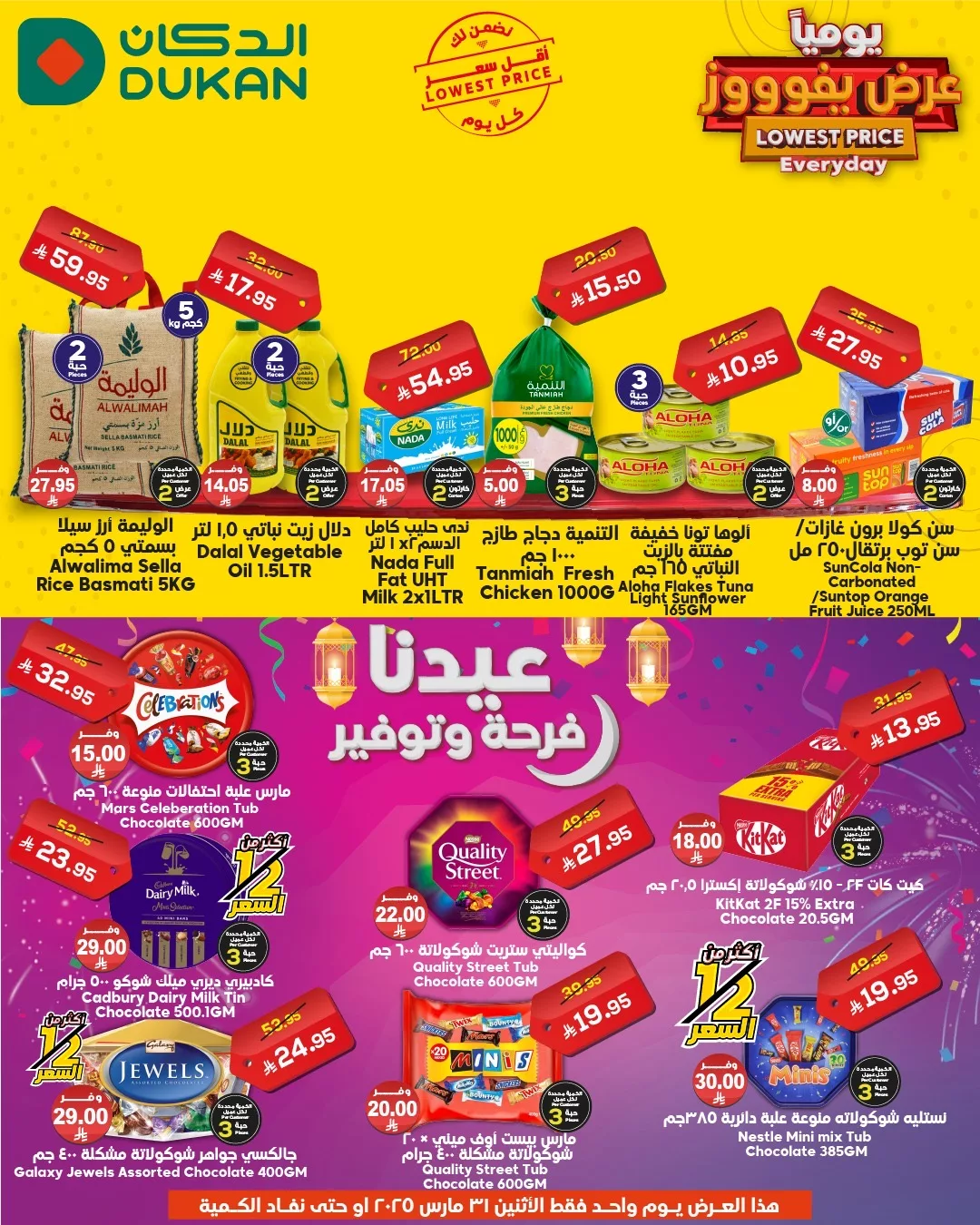 العرض يشمل أيضا مجموعة مختارة من الشوكولاتة الفاخرة والحلويات بمناسبة قرب حلول عيد الفطر المبارك تحت شعار “عيدنا فرحة وتوفير” حيث تتوفر منتجات مثل شوكولاتة كواليتي ستريت و مارس و كيت كات وجلاكسي بأسعار مخفضة تصل إلى أكثر من 50% مما يجعلها فرصة رائعة لشراء ضيافة العيد بأقل التكاليف