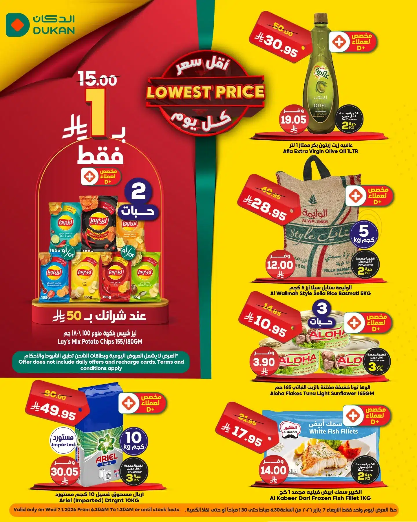 تحتوي عروض الدكان جدة علي : عافية زيت زيتون – الوليمة ستايل سيلا ارز بسمتي – ليز شيبسي – تونا خفيفة الوها – الكبير سمك ابيض فيليه – اريال مسحوق غسيل