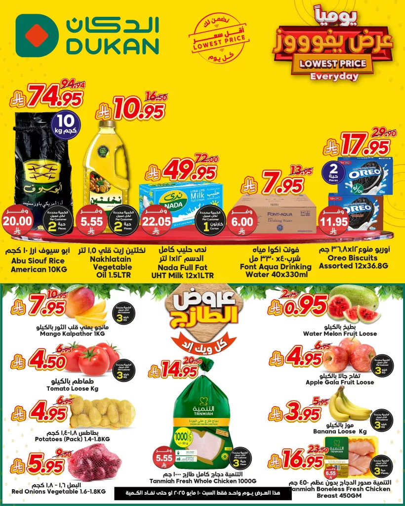 عروض الدكان جدة اليوم تشمل أيضا فواكه وخضروات طازجة مختارة بعناية مثل المانجو والطماطم والبطاطس والبصل والبطيخ لتضفي لمسة صحية على مائدتك اليومية كما تتوفر لحوم ودواجن مثل الدجاج الطازج والصدور المجمدة لتلبي متطلبات وجباتك الرئيسية مما يجعل هذه العروض فرصة لا تفوت