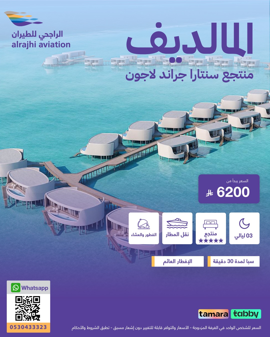 عرض منتجع سنتارا جراند لاجون من الراجحي للطيران كواحد من العروض الفريدة التي توفر تجربة إقامة فاخرة بأسعار تنافسي يمكنكم الاستمتاع بإقامة مثالية لمدة 3 ليالي في واحد من أجمل منتجعات المالديف والذي يتميز بموقعه المذهل بالإضافة إلى باقة مميزة تشمل الإفطار والعشاء وخدمة النقل من وإلى المطار ويبدأ سعر العرض من 6200 ريال للشخص في الغرفة المزدوجة مع سبا لمدة 30 دقيقة ضمن باقة الإقامه لا تفوتوا افضل العروض و اوفرها