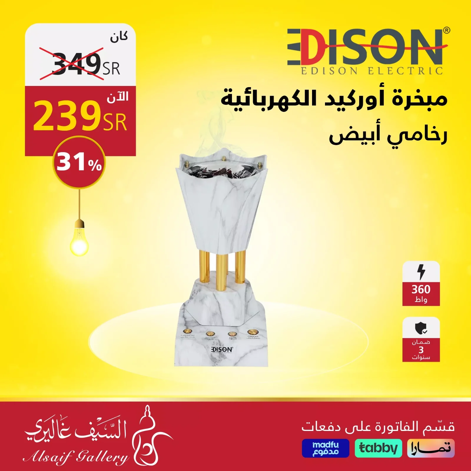 - مبخرة أوركيد الكهربائية رخامي أبيض: 239 ريال سعودي، بقدرة 360 واط، ضمان لمدة 3 سنوات