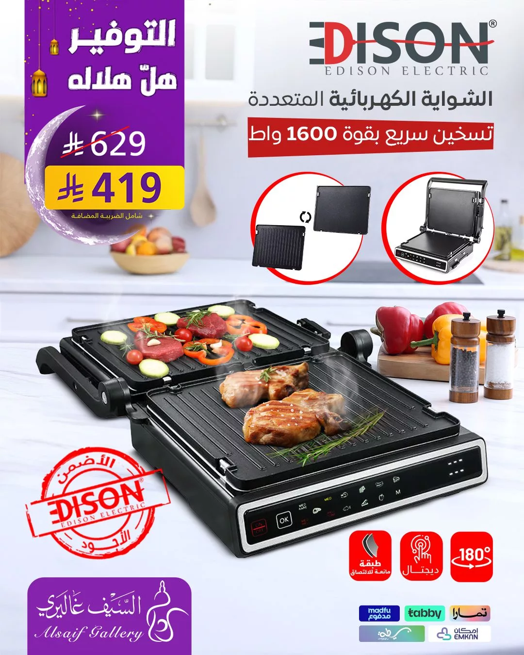 • الشواية الكهربائية المتعددة من إيديسون – تسخين سريع بقوة 1600 واط – السعر: 419 ريال (بدلًا من 629 ريال)