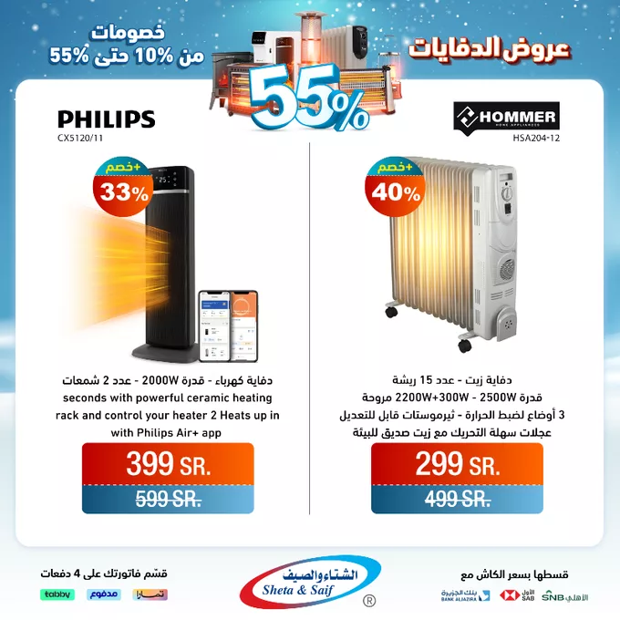 تتنوع العروض أيضا لتشمل منتجات الدفايات بأشكالها المختلفة سواء كانت دفايات زيت أو كهرباء، بتصاميم عملية وكفاءة عالية لتوفير التدفئة المثالية خلال فصل الشتاء و تأتي هذه العروض بأسعار منافسة وخصومات تصل حتى 55% مما يجعلها مثالية للاستفادة منها ضمن فترة العروض المميزة