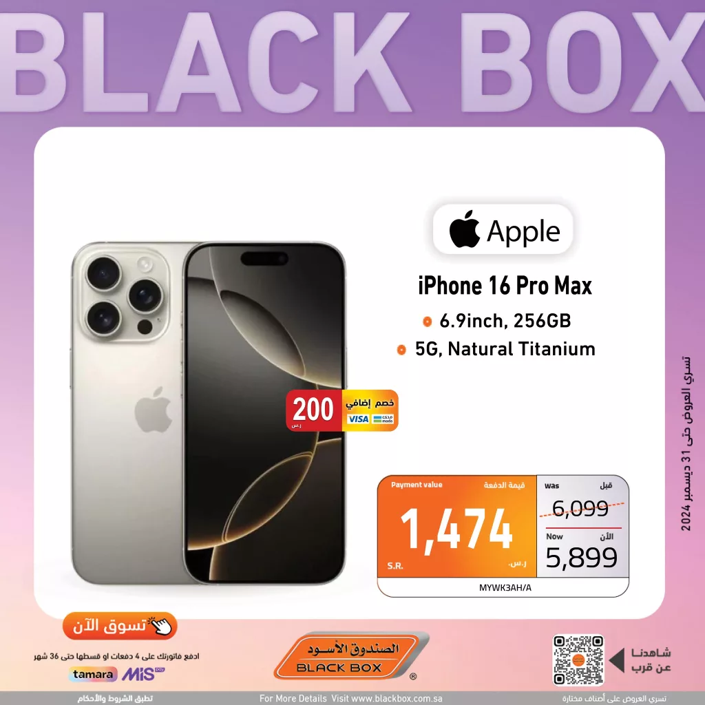 عروض الصندوق الأسود تمنحك فرصة للحصول على أحدث الأجهزة مع خطط دفع ميسرة عبر أنظمة تمارا وميز مما يتيح لك تقسيم قيمة الفواتير على 4 دفعات مريحة بدون فوائد احصل على هاتفك المفضل الآن بأسعار تنافسية وتصميمات مبتكرة لتلبية احتياجاتك العصرية.