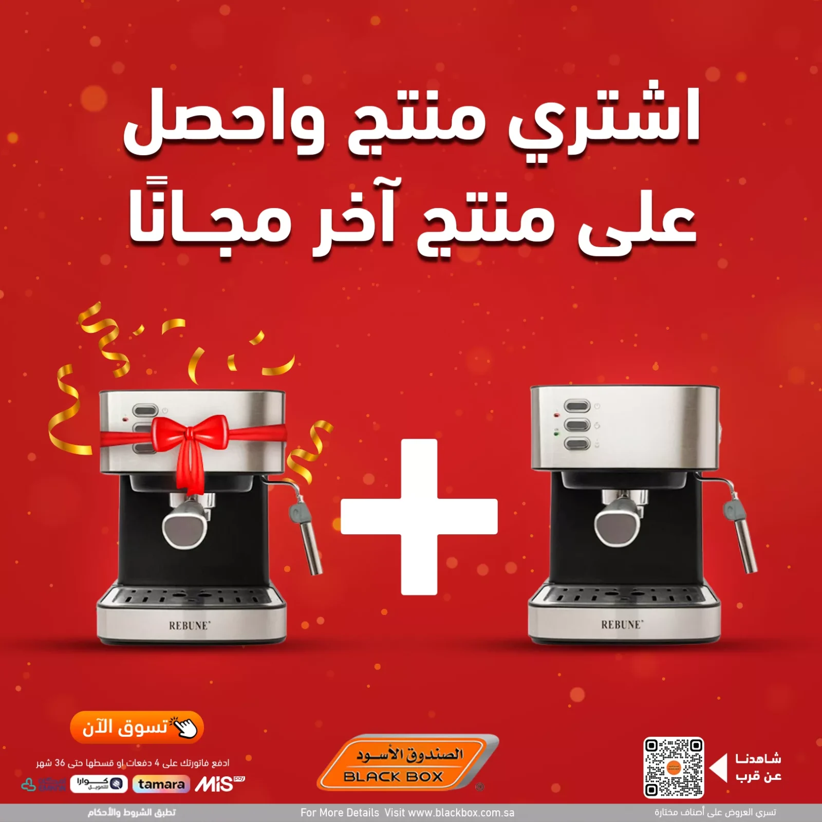 عرض ماكينات تحضير القهوة من الصندوق الأسود يوفر ماكينات قهوة مصممة لمحبي الإسبريسو والقهوة المميزة المنتجات المعروضة تتميز بتقنيات متقدمة مثل مضخات الضغط العالي وتصاميمها الأنيقة التي تضيف لمسة جمالية لأي مطبخ و تشمل هذه العروض هدايا إضافية تضيف قيمة أكبر للصفقات