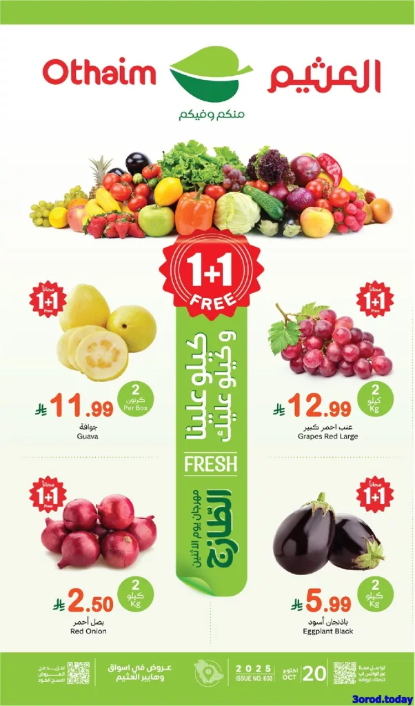 عروض العثيم الاثنين 28 ربيع الثاني 1447هـ تقدم الخضروات والفواكه و تشكيلة من الجبن بأنواعه مثل جبن فيتا بالزيتون الأخضر أو الفلفل وبتوفر كمان اللحوم الطازجة والدواجن مثل اللحم المفروم البقري البارد ولحم الماعز بالعظم ولحم الغنم البربري وبتقدم الكثير من اجهزة المطبخ و باقل الاسعار في عروض العثيم الطازج فقط تابعونا ليصلكم كل جديد .