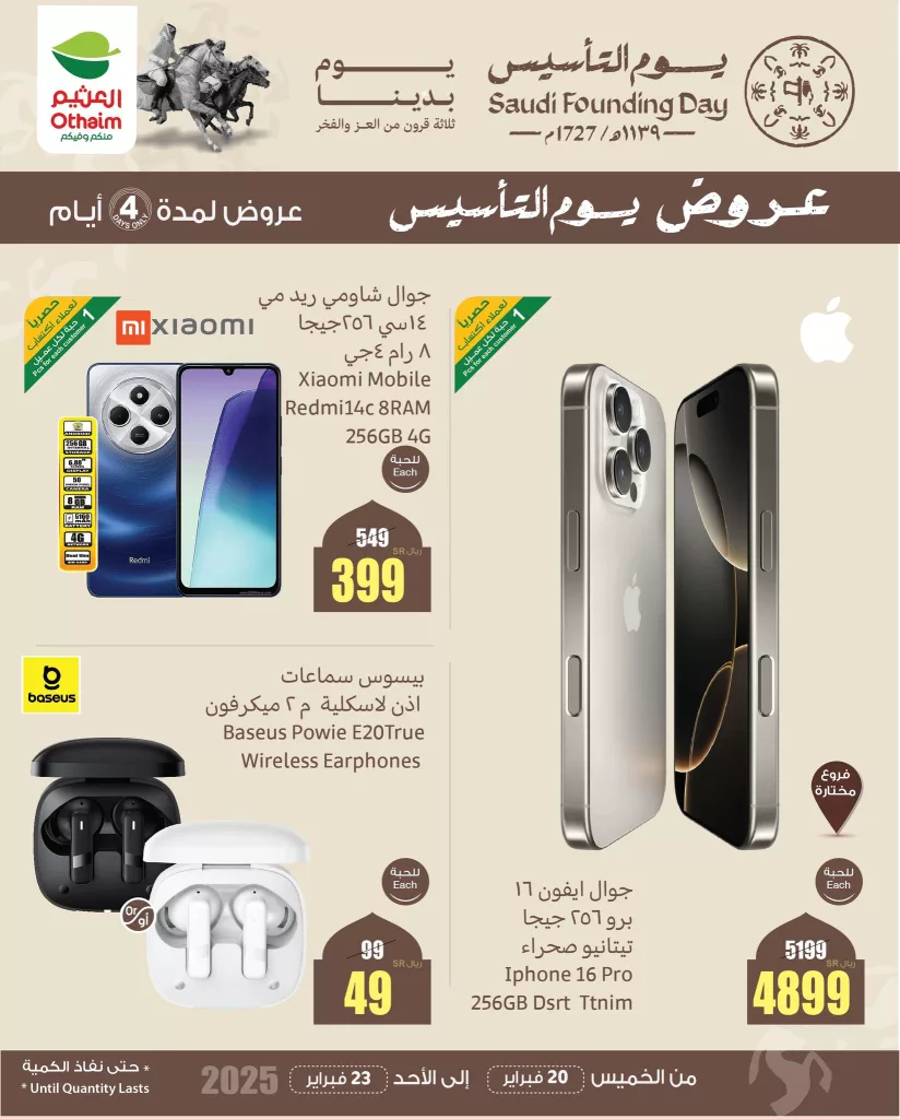 عروض العثيم ليوم التأسيس الخميس 20-2-2025 و تأتي هذا العام بتخفيضات هائلة على أحدث الأجهزة الذكية والإلكترونيات مما يجعلها فرصة مثالية لاقتناء هواتف سامسونج وشاومي وآيفون بأسعار منافسة و تشمل العروض مجموعة متميزة من الهواتف الذكية بمواصفات متقدمة مثل سامسونج A35 الداعم لشبكات 5G
