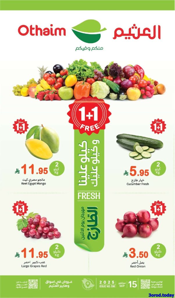 عروض العثيم الاثنين 15 سبتمبر 2025 تقدم لكم تشكيلة واسعة من أجود أنواع الخضار والفواكه الطازجة و تجدون الموز والتفاح والبرتقال العصير وأبو سرة بالإضافة إلى التمور والكمثرى و تشمل كذلك أقوى التخفيضات على اللحوم الطازجة والدواجن مثل اللحوم البقرية المفرومة واللحم الغنم واللحم التيس بالعظم مع عرض 1+1 مجانا