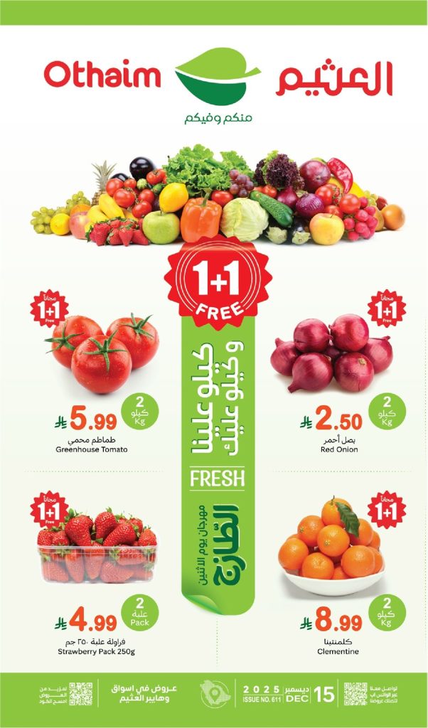 نستعرض معاكم احدث عروض العثيم الطازجة ليوم الاثنين 15 ديسمبر 2025 و تحتوي علي الجبن البيضاء والجبن الشيدر المعلبة والزيتون الأسود والأخضر الشرائح والمخللات المشكلة بجانب اللحوم المفرومة ولحوم الغنم والبقر و بتوفر كمان تشكيلات من الطماطم والخيار والبصل والبطاطا والكوسة والعنب والكيوي والرمان والجوافة