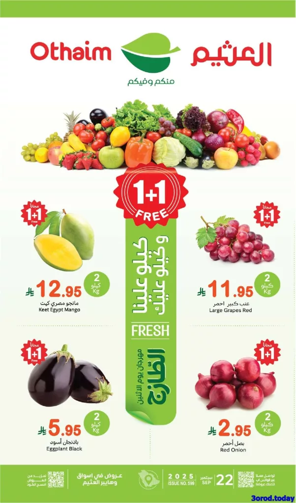 نستعرض لكم عروض العثيم الطازج الاثنين 22 سبتمبر 2025 و تحتوي تخفيضات مميزة على مجموعة من الخضروات والفواكه الطازجة من الكيوي و المانجو المصري و الباذنجان الأسود، العنب الأحمر الكبير و تضم عروض مهرجان الطازج من العثيم علي لحم الغنم بالعظم ولحم الضأن بالعظم بالإضافة إلى المفروم البرازيلي و الجبن و الالكترونيات