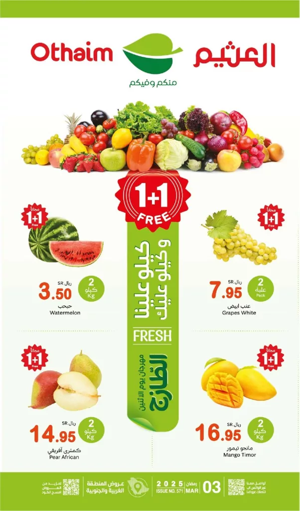 عروض العثيم المنطقة الغربية الاثنين 3 مارس 2025 توفر لك أفضل المنتجات الطازجة من الخضروات والفواكه بأسعار تنافسية و استمتع بعروض 1+1 المجانية عند شراء خس أيس بيرج و فلفل حار أخضر وطماطم شيري مما يمكنك من مضاعفة مشترياتك بنفس السعر كما يمكنك الاستفادة من خصومات حصرية على الملفوف المحسن