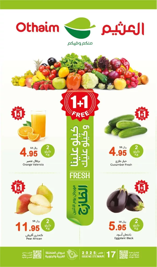 عروض العثيم المنطقة الغربية الاثنين 17 مارس 2025 تقدم خصومات مذهلة على المنتجات الغذائية والمخبوزات حيث تشمل العروض تشكيلة واسعة من الفواكه الطازجة مثل البرتقال العصير والكمثرى الأفريقية بالإضافة إلى مجموعة مختارة من الخضروات بأسعار تنافسية.