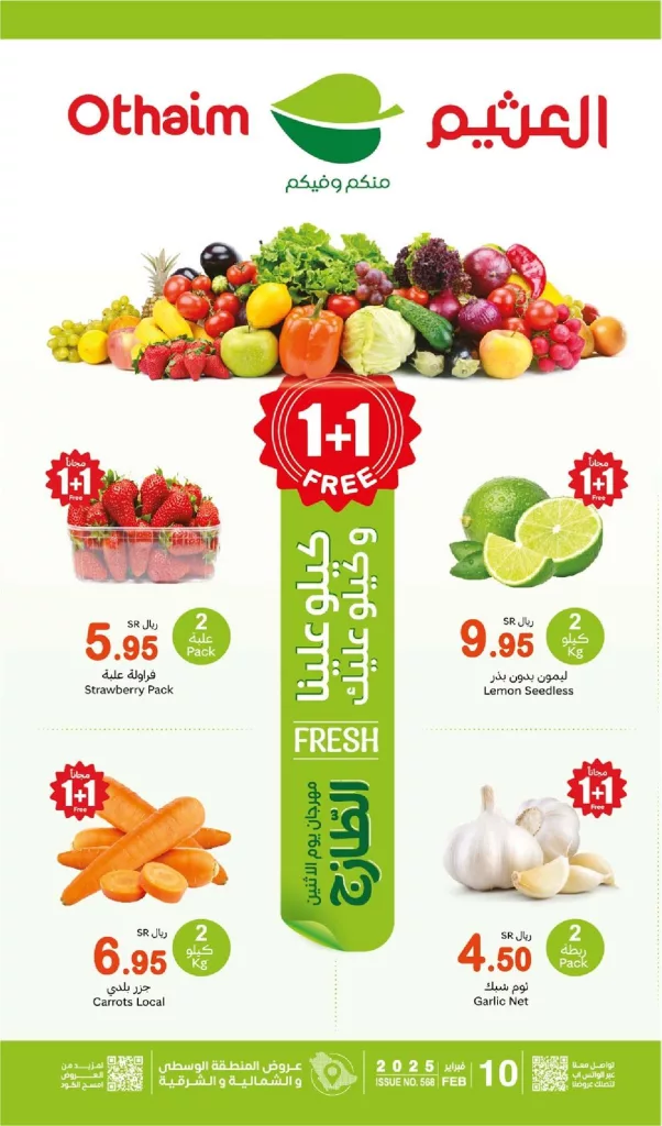 عروض العثيم الطازج الاثنين 10 فبراير 2025 تقدم لمحبي التسوق تجربة فريدة مع خصومات مميزة على تشكيلة واسعة من الخضروات والفواكه الطازجة احصل على عرض 1+1 مجانا على العديد من الأصناف مثل الفراولة و الليمون والجزر البلدي لتستمتع بمنتجات طازجة بأسعار أقل وهناك تخفيضات حصرية على البرتقال و الطماطم الشيري