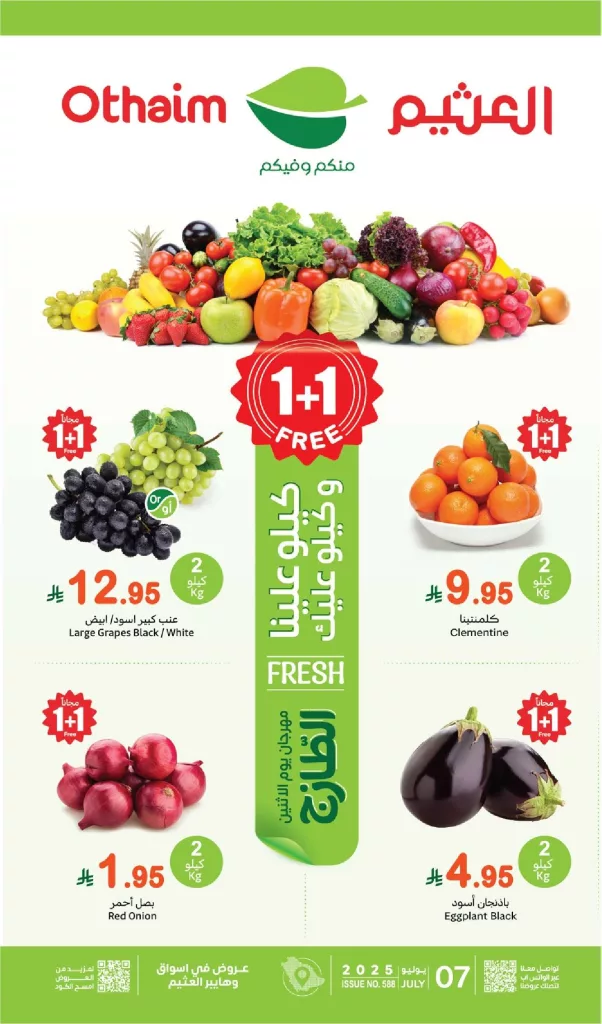 عروض العثيم الطازج الاثنين 7-7-2025 تقدم تشكيلة مميزة من الفواكه الطازجة التي تشمل العنب الأسود والأبيض والكليمنتينا والليمون والتفاح الأخضر والمانجو والأفوكادو بالإضافة إلى تمر السكري وجميعها ضمن عروض مغرية للشراء الفوري كما يشمل العرض البرتقال أبو صرة بنكهات منعشة