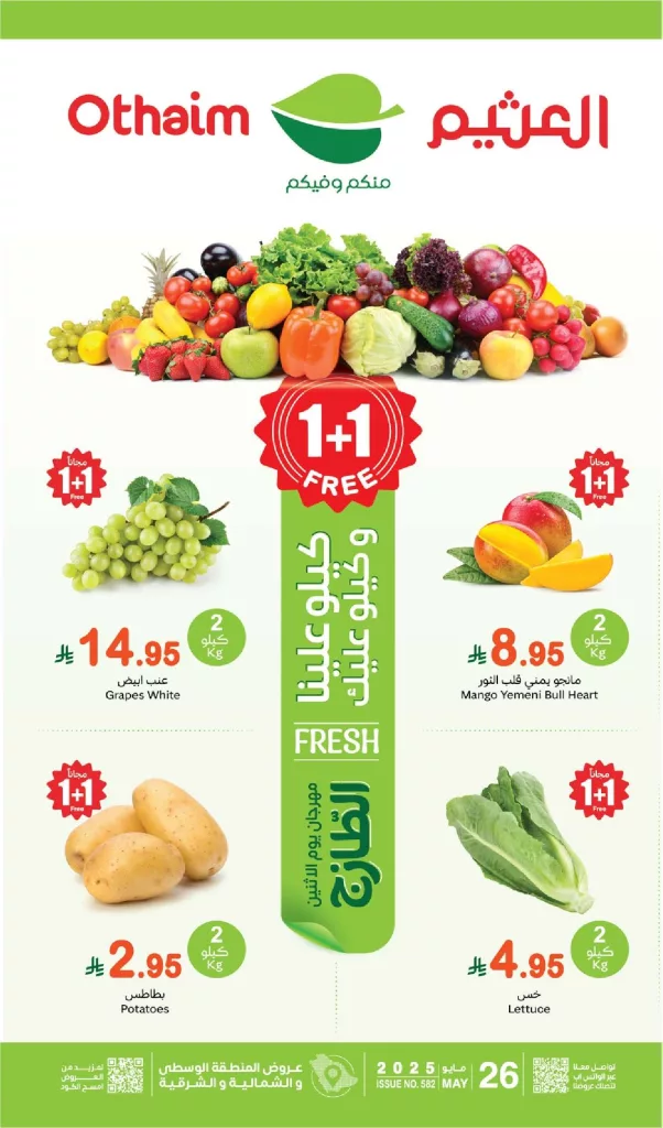 عروض العثيم الطازج الاثنين 26 مايو 2025 تقدم مجموعة متنوعة من الخضروات والفواكه الطازجة التي تلبي احتياجات الأسرة اليومية وتشجع على التسوق الذكي بتوفير العرض الشهير 1+1 مجانًا تشمل العروض فواكه موسمية مثل العنب والمانجو والرمان والكمثرى إضافة إلى الخس والبطاطس والبصل باقل الاسعار