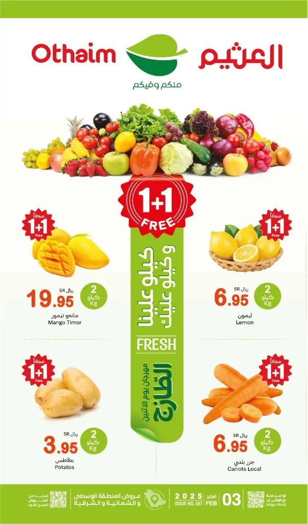 عروض العثيم الطازج الاثنين 3 فبراير 2025 تقدم خصومات رائعة على أجود أنواع الفواكه والخضروات الطازجة لتلبية احتياجات المستهلك بأسعار منافسة و تتوفر خيارات متنوعة من الفواكه مثل العنب الأسود والليمون والطماطم الشيري مما يجعلها فرصة مثالية لتخزين المنتجات الطازجة.