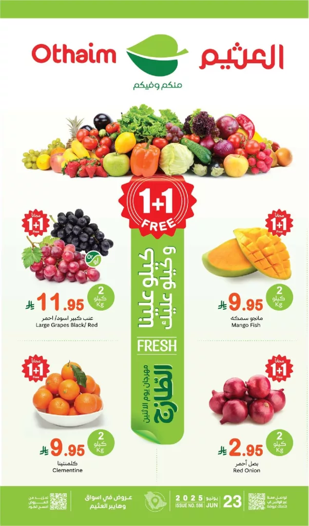 نستعرض لكم اليوم احدث عروض العثيم الاثنين 23 يونيو 2025 تقدم مجموعة مميزة من الخضروات والفواكه الطازجة ضمن حملة كيلو علينا وكيلو عليك حيث يمكن للمتسوقين الاستفادة من عرض 1+1 المجاني على تشكيلة واسعة من الأصناف الطازجة مثل العنب والمانجو والبصل الأحمر والكلمنتينا