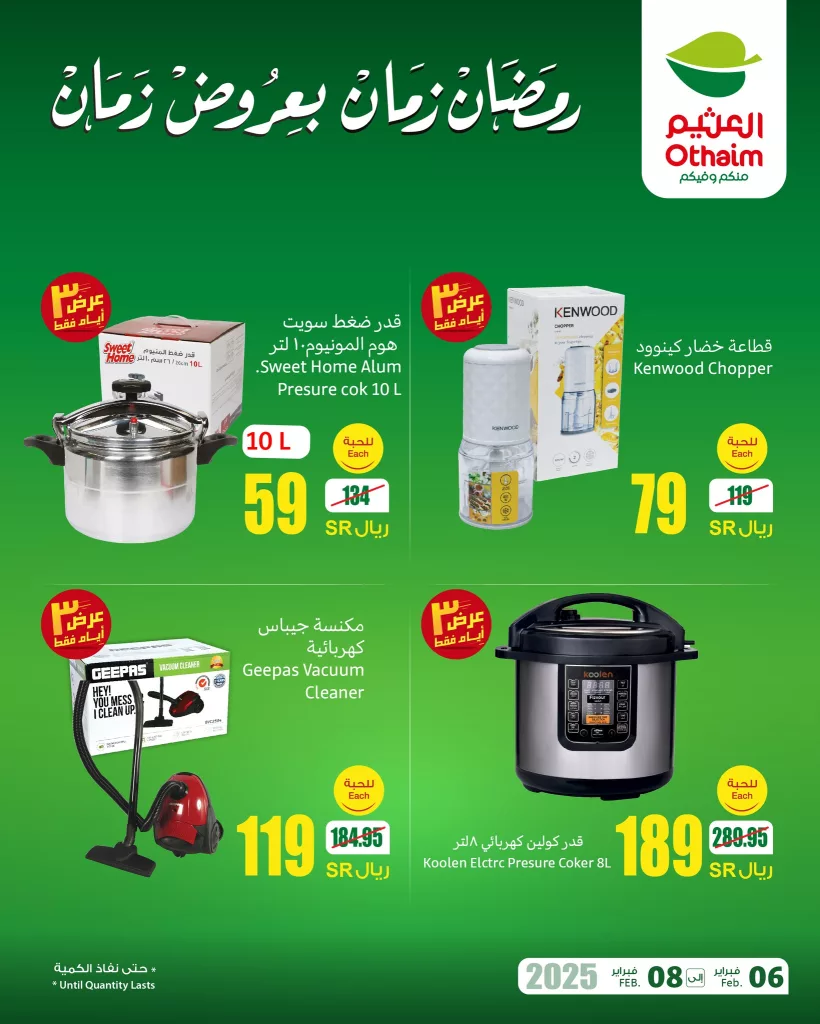 عروض العثيم تأتيكم الجمعة 7 فبراير 2025 مع تخفيضات كبيرة على مختلف الأجهزة المنزلية وأدوات المطبخ بمناسبة شهر رمضان الكريم و تتوفر لكم مجموعة واسعة من الأجهزة التي تسهل عليكم تحضير الأكلات الرمضانية من قدور الضغط التي تضمن طهيا سريعا إلى محضرات الطعام التي تساعد في إعداد المكونات بوقت قياسي.