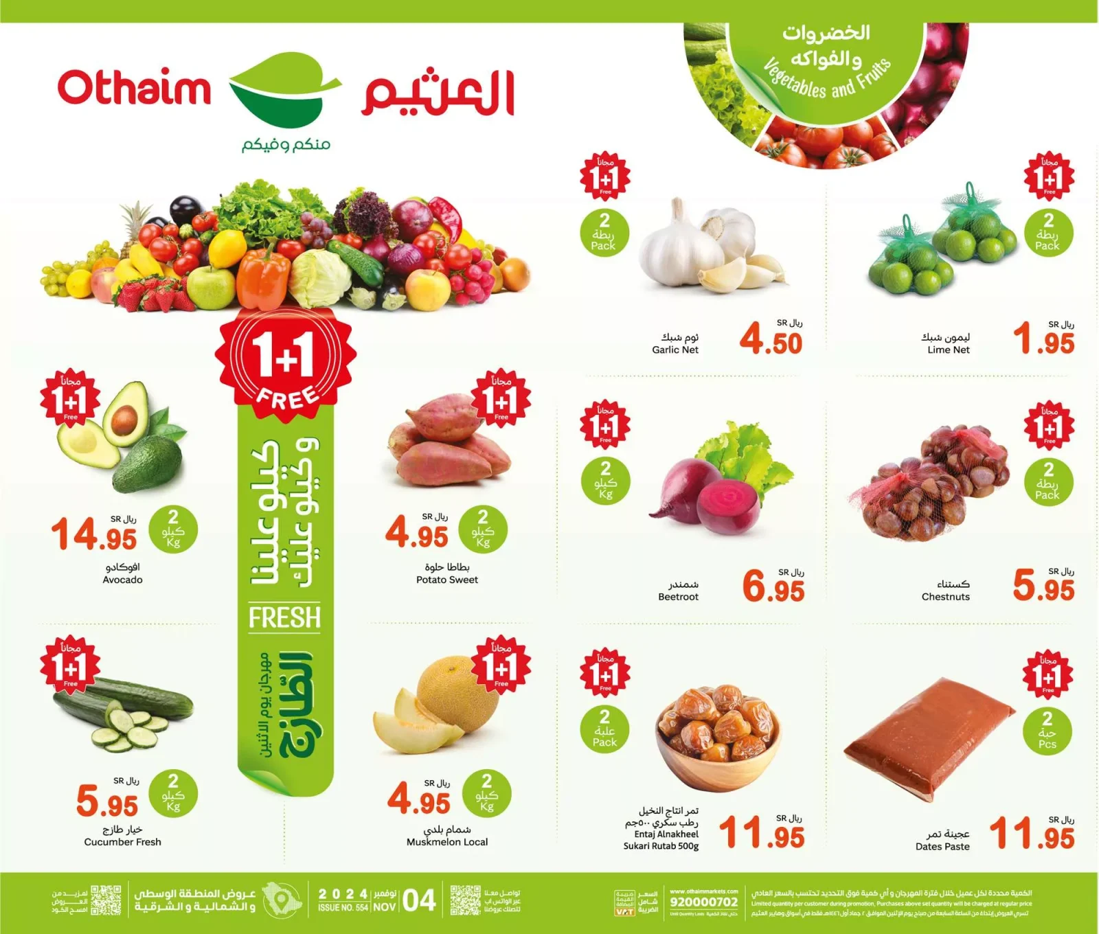 عروض العثيم الاثنين 4 نوفمبر 2024 تقدم لكم مجموعة واسعة من المنتجات بأسعار مخفضة مما يتيح لكم الفرصة للاستفادة من خصومات كبيرة على تشكيلة متنوعة من الخضروات والفواكه الطازجة و يشمل العرض منتجات مختارة بجودة عالية وأسعار منافسة، مع عروض 1+1 مجانا على العديد من الأصناف