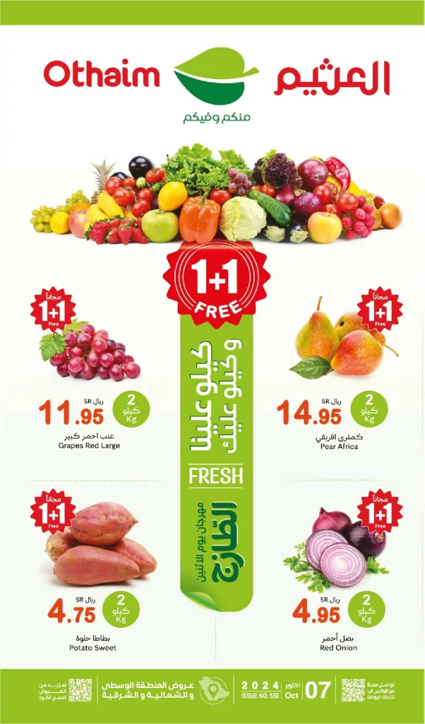 عروض العثيم الاثنين 7 أكتوبر 2024 تقدم تشكيلة واسعة من الفواكه والخضروات الطازجة بأسعار تنافسية مما يتيح للعملاء فرصة الاستفادة من خصومات مميزة على العديد من المنتجات و العرض يشمل عروض 1+1 مجانية على المنتجات الشهيرة مثل العنب الأحمر الكبير والكمثرى الإفريقي والليمون الفيتنامي وغيرها.