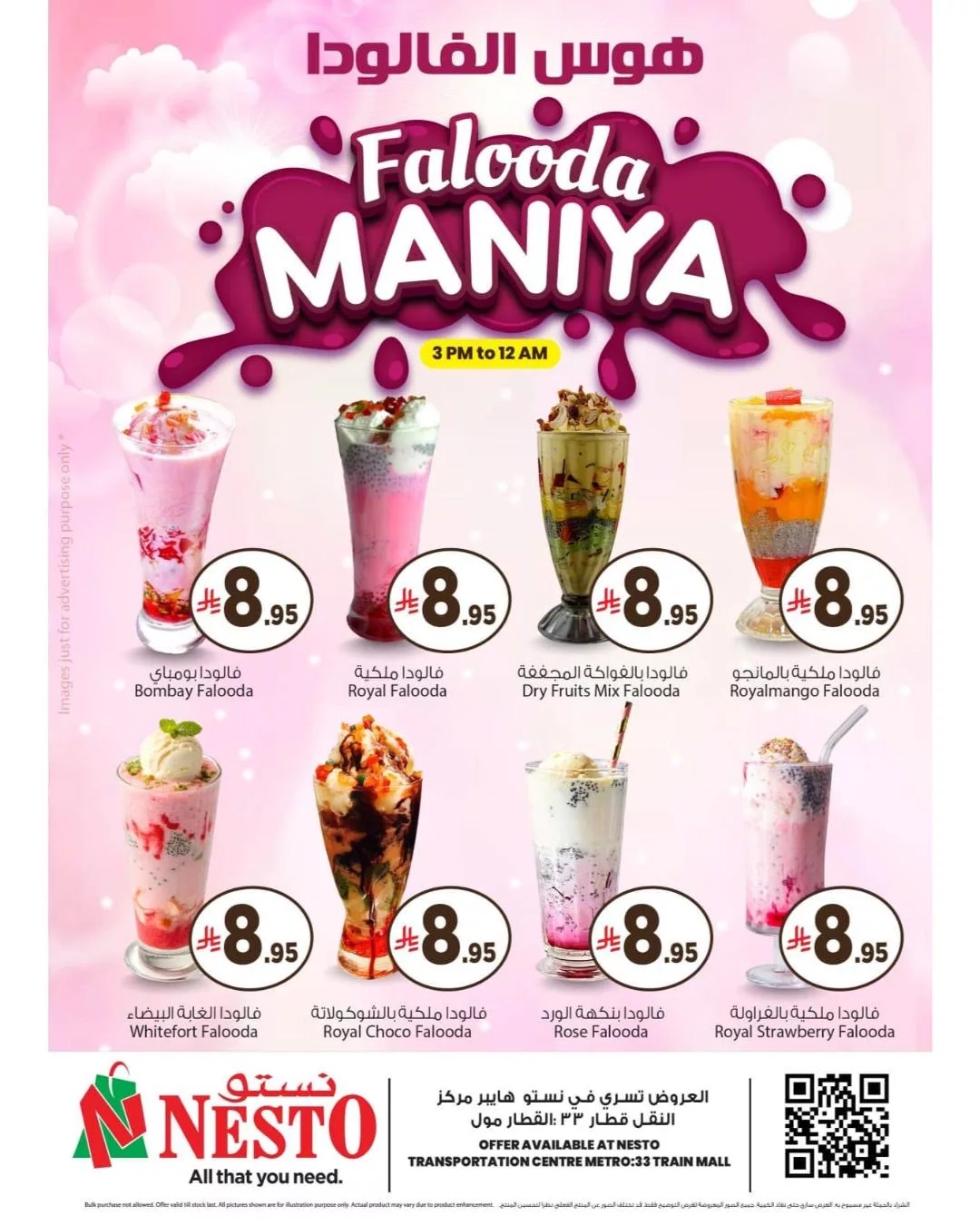 ومن هذا المنطلق، يقدم نستو هايبر ماركت في مركز النقل – محطة مترو 33 بالرياض عرضًا لا يُقاوم تحت عنوان “هوس الفالودا – Falooda Maniya” و**”منتجات صن داي المميزة – Special Sundae”**، متاحة يوميًا من الساعة 3 مساءً حتى الساعة 12 منتصف الليل