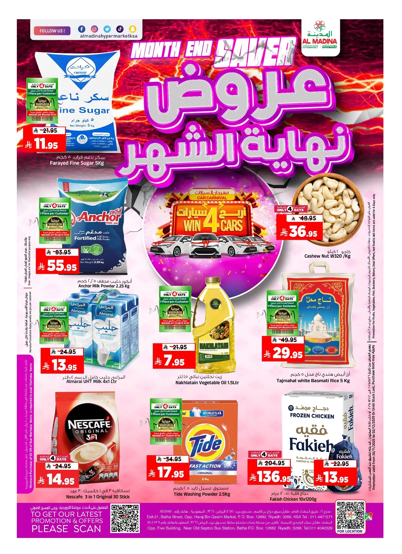 عروض المدينة هايبر ماركت الأربعاء 26-11-2025 تضم مجموعة غذائية متنوعة تشمل القرع العسلي والتوت الأسود والبرقوق مع الجبنة الفرنسية وشرائح لحم الغنم والمعجنات ثم تضم الأجهزة المنزلية شوايات كهربائية وخلاطات معدنية ومقالي سيراميك حرارية كبيرة وأجهزة طهي بطيء وأفران صغيرة وغيرها من مستلزمات المطبخ باقل الاسعار