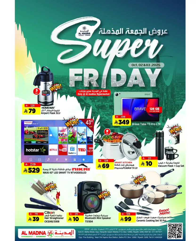 عروض المدينة هايبر ماركت الجمعة المذهلة يومي 3 و 4 اكتوبر 2025 لا تفوتوا افضل العروض على الشاشات و الاجهزة الكهربائية و المواد الغذائيه و الفواكه و الخضروات و اللحوم و الدجاج و العروض الطازجه لعروض نهاية الاسبوع المميزه في المدينة هايبر ماركت السعودية.
