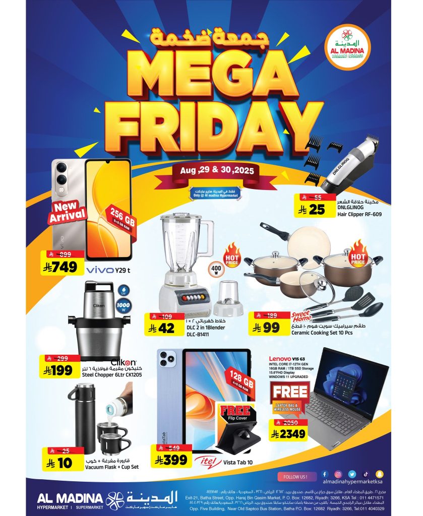 عروض الجمعة الضخمة المدينة هايبر ماركت تقدم تشكيلة مذهلة من الإلكترونيات والأجهزة المنزلية تشمل أحدث الجوالات والأجهزة اللوحية مثل فيفو وآيتل بالإضافة إلى خلاطات ومفرمات عالية الجودة وطقم قدور سيراميك أنيق كما تتضمن العرض ملحقات عملية مثل ترمس بكوب وماكينة حلاقة كهربائية باقل الاسعار المناسبة للجميع