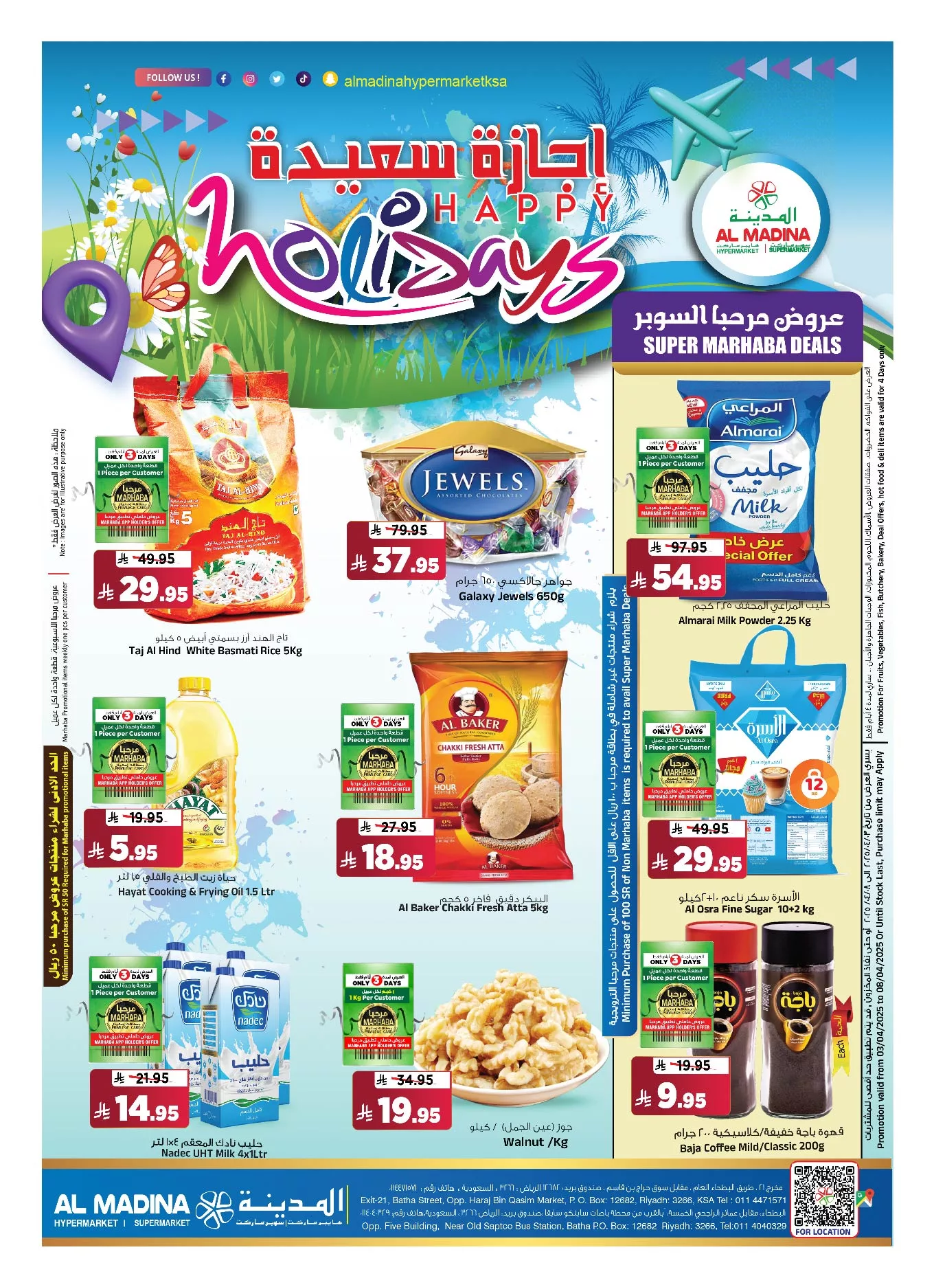 عروض عطلة سعيدة من هايبر ماركت المدينة المنورة والتي انطلقت بتاريخ 3 أبريل 2025 وتستمر حتى 8 أبريل 2025، لتمنح المتسوقين في الرياض تجربة تسوق استثنائية تجمع بين التنوع الكبير والأسعار المغرية