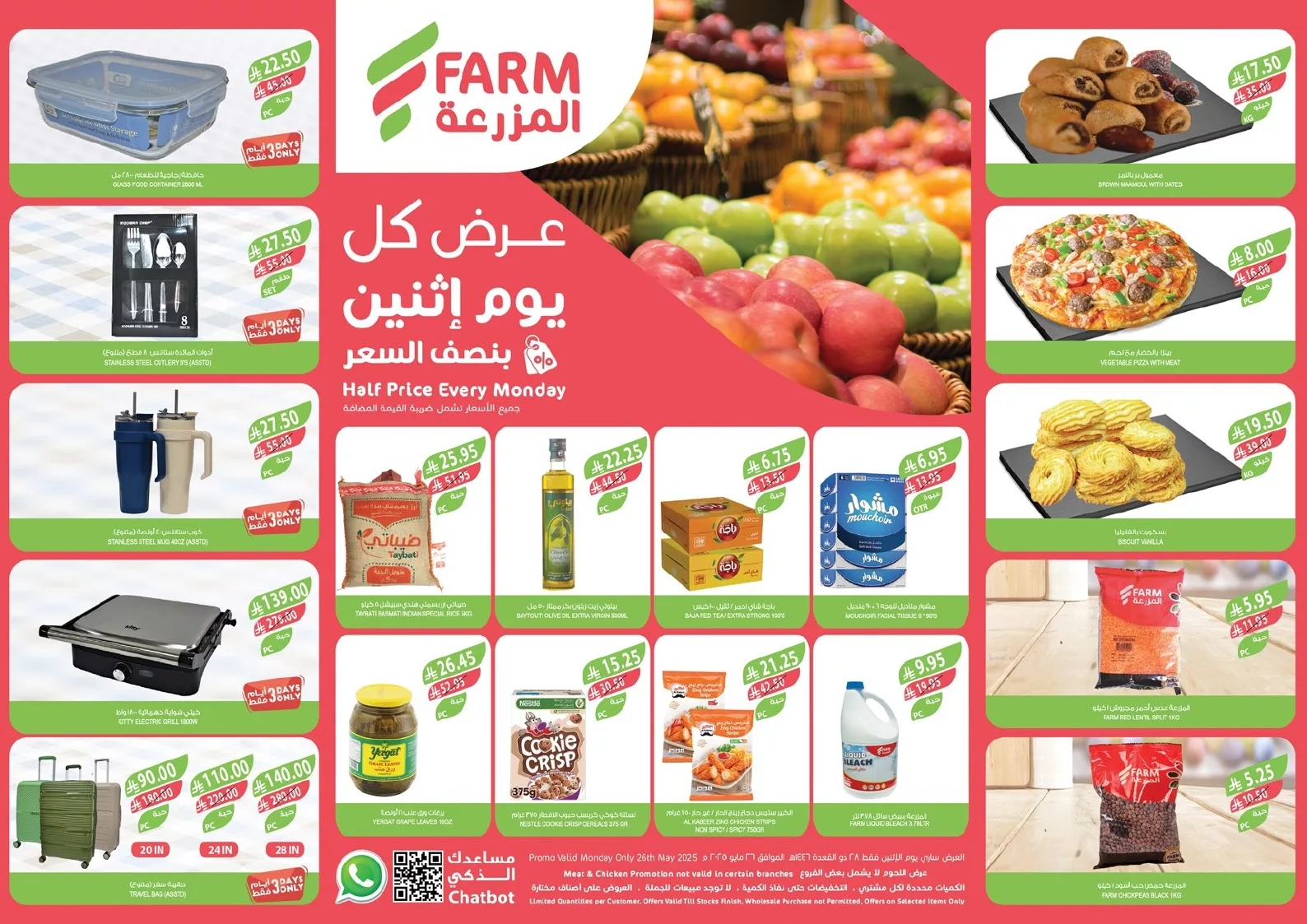 تقدم أسواق المزرعة الغربية بالمملكة العربية السعودية مجموعة رائعة من التخفيضات الأسبوعية التي ينتظرها المتسوقون كل يوم إثنين، تحت اسم عرض يوم الإثنين بنصف السعر، وهي فرصة مثالية لاقتناء المنتجات الطازجة والسلع اليومية بأسعار منافسة للغاية. وتغطي هذه العروض تشكيلة متنوعة من المنتجات تشمل المواد الغذائية، الخضروات والفواكه، اللحوم، ومنتجات العناية المنزلية والشخصية