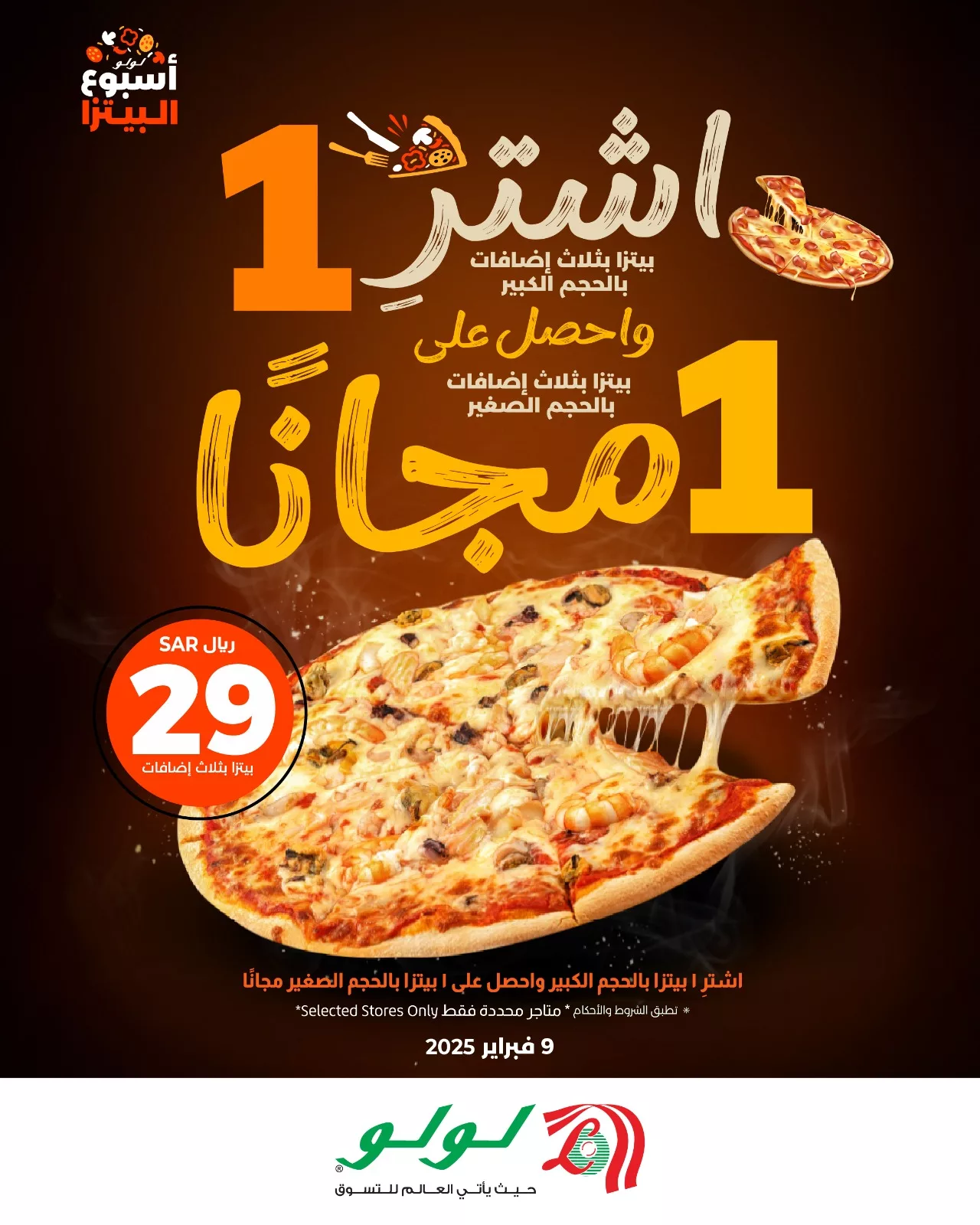 اشترِ بيتزا كبيرة بـ 3 إضافات واحصل على بيتزا صغيرة بـ 3 إضافات مجانا فقط بـ 29 ريال
