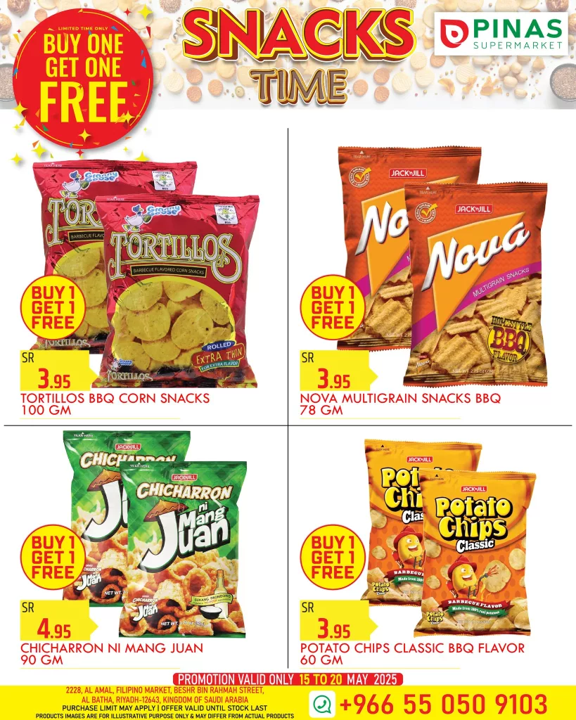 تُعد عروض السناك في السعودية من أكثر العروض التي تهم العائلات والأفراد على حد سواء، فهي فرصة مثالية للحصول على وجبات خفيفة لذيذة بأسعار مغرية. وبيناس سوبرماركت، أحد أشهر الوجهات التسويقية في حي البطحاء بالرياض، يقدم لك الآن عرضاً لا يُفوت بعنوان SNACKS TIME – اشترِ واحدة واحصل على الأخرى مجاناً من 15 إلى 20 مايو 2025