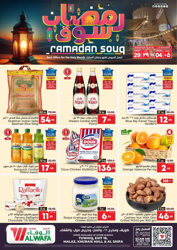 عروض الوفاء هايبر ماركت لشهر رمضان الكريم الأربعاء 29 يناير 2025 تمنحك فرصة رائعة للحصول على أقوى التخفيضات على السلع الأساسية حيث تشمل العروض الأجبان الفاخرة و الزبدة الطبيعية والحليب الطازج كما تتوفر خصومات على اللحوم الطازجة و الدواجن المحلية والمأكولات البحرية الطازجة