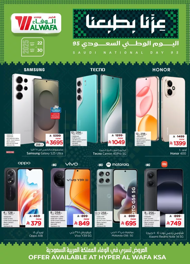 تقدم الوفاء هايبر ماركت عروضا مميزة الاثنين 22-9-2025 على أجهزة الكمبيوتر المحمول والإلكترونيات احتفالا باليوم الوطني السعودي تشمل علي لابتوب من ماركة لينوفو وديل بالإضافة إلى تابلت من هونر وتتوفر أيضا أجهزة أخرى مثل طابعات إتش بي وسماعات رأس من كات إير و يشمل تشكيلة واسعة من أحدث الجوالات باقل الاسعار