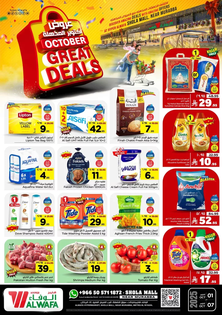 عروض الوفاء هايبر ماركت الأسبوعية الأربعاء 1-10-2025 تبدأ بالعروض على أجهزة الشوي الكهربائية وأجهزة تبريد المياه وأجهزة القلايات الهوائية ثم تواصل بتقديم خصومات على اللحوم الطازجة والدواجن الكاملة بجانب الخضروات كالسبانخ والخرشوف والفلفل البرتقالي والفواكه كالبرتقال والمانجو والكمثرى