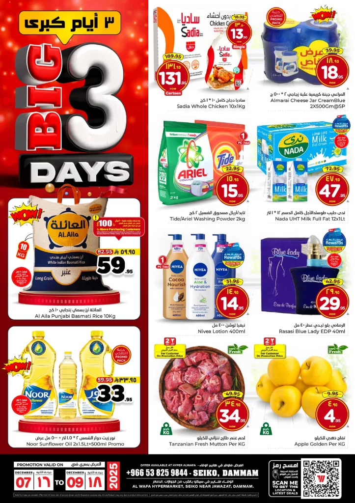 عروض الوفاء هايبر ماركت الدمام 3 ايام من 7 إلى 9 ديسمبر 2025 حان الوقت لتسوق لم يسبق له مثيل مع 3 أيام مليئة بالتوفير الضخم والصفقات الطازجة والمفاجأت لا تفوتوا افضل العروض الخاصة على الخضار و الفواكه و اللحوم في فرعنا في الدمام سيكو واغتنموا التوفير