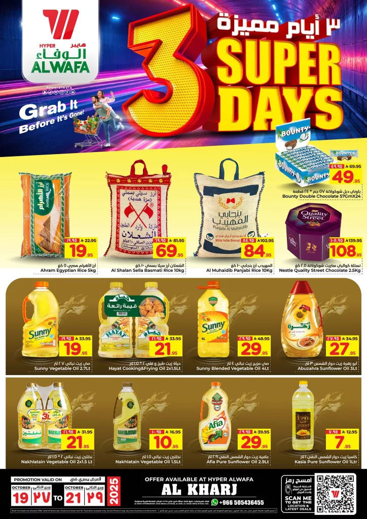 عروض الوفاء هايبر ماركت الطازج الاحد 27 ربيع الثاني 1447هـ تقدم تشكيلة من المنتجات الغذائية من منتجات الألبان بأنواعها والمشروبات الصحية المجمدة وأصناف الخضروات المجمدة والدواجن إضافة إلى الحلويات والعصائر ومواد العناية الشخصية ومساحيق الغسيل بالإضافة إلى منتجات الأطفال والمناديل الورقية باقل الاسعار