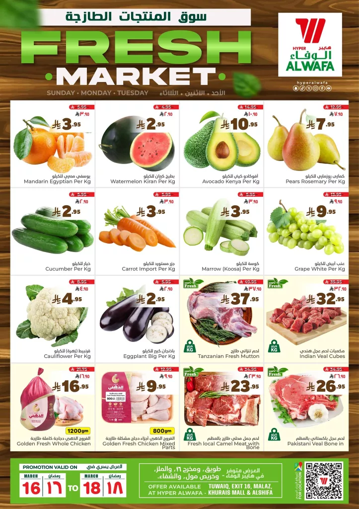 تقدم عروض الوفاء هايبر ماركت هذا الأسبوع تشكيلة متنوعة من المنتجات الطازجة بأفضل الأسعار حيث يمكنك الحصول على الخضروات والفواكه الطازجة بأقل الأسعار مثل اليوسفي المصري والبطيخ الكيران والعنب الأبيض بالإضافة إلى الخيار والكوسة الطازجة التي تناسب مختلف الأطباق اليومية.