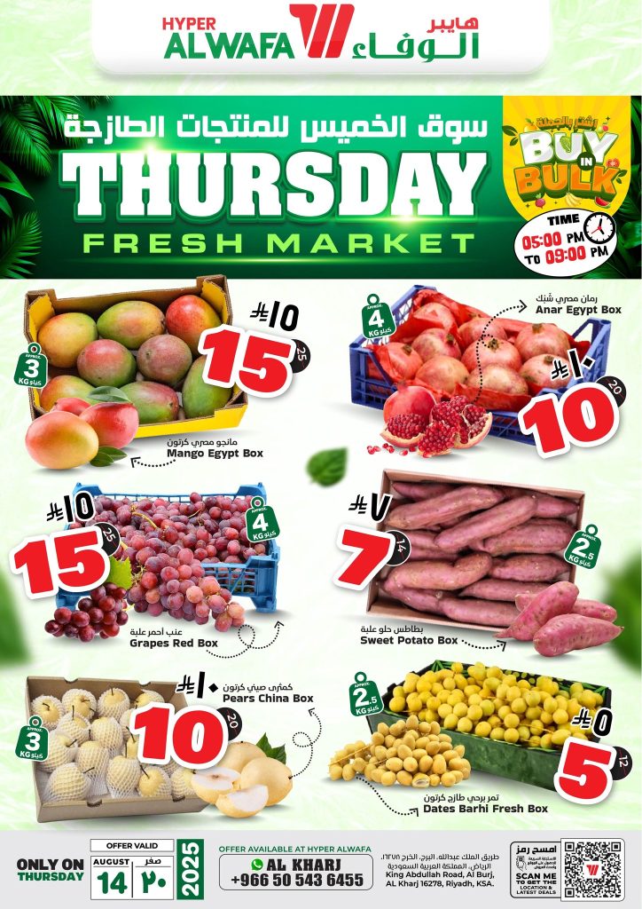 عروض الوفاء هايبر ماركت الخميس 14 أغسطس 2025 تقدم مجموعة مميزة من الخضروات الطازجة مثل البطيخ الكامل والبصل والبطاطس والجزر إلى جانب الشمام والليمون الفيتنامي و تشمل تشكيلة واسعة من الفواكه المستوردة عالية الجودة مثل المانجو المصري والرمان والعنب الأحمر كما تتوفر الكمثرى الصينية والتمر البرحي