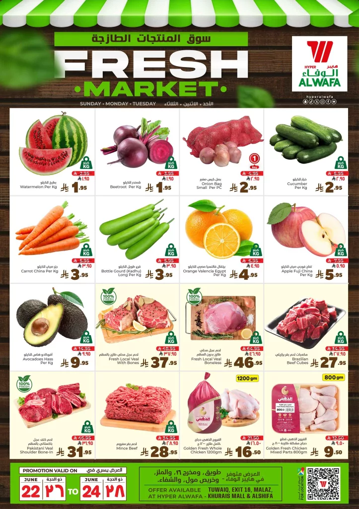 عروض الوفاء هايبر ماركت لا تقتصر فقط على المنتجات الجافة بل تشمل أيضًا خضروات وفواكه طازجة مختارة بعناية مثل البطيخ والخيار والجزر والبرتقال إلى جانب عروض مميزة على اللحوم الطازجة مثل اللحم البقري والدجاج الكامل والمفروم مما يجعلها فرصة مثالية للتسوق الذكي