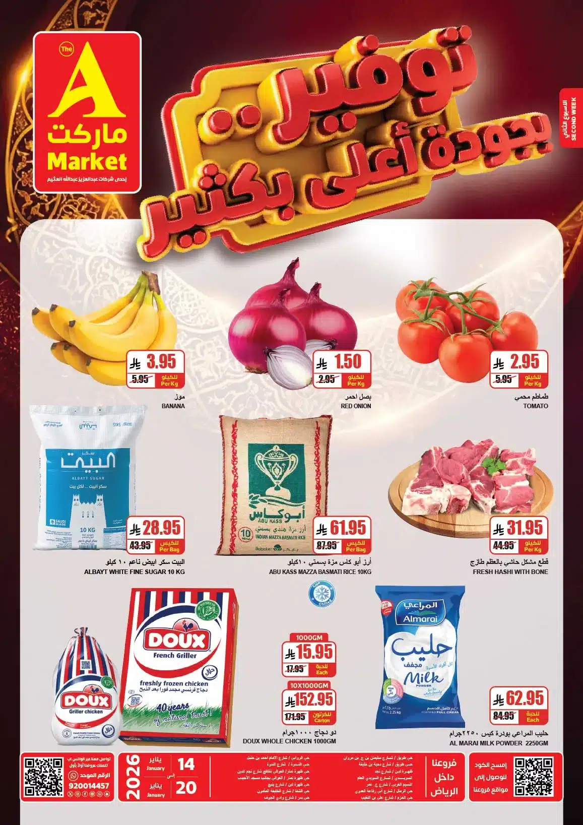 إيه ماركت الرياض الأربعاء 25 رجب 1447 هـ الموافق 14 يناير 2026 و تحتوي علي الأجهزة المنزلية مثل قلاية بدون زيت وخلاط يدوي وميزان وزن الجسم وسخان مياه ومحمصة توست ومكواة بخار ومروحة كهربائية وغلاية مياه و تشمل التمور والأرز المصري والحليب طويل الأجل والبيض والخضروات واللحم المبرد والدجاج وزيت القلي والسكر والشاي