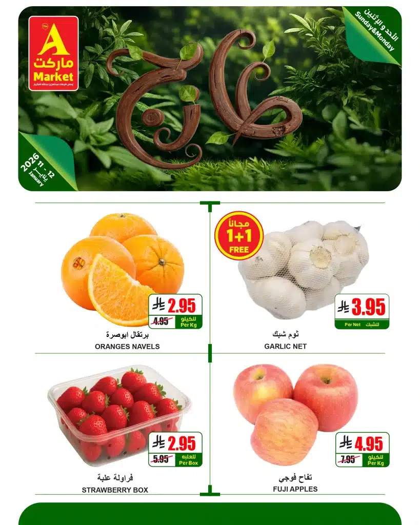 عروض ايه ماركت الرياض الاحد 11 يناير 2026 – 22 رجب 1447هـ و تحتوي علي لحوم باكستانية مفرومة بدون عظم وعظم مع كفتة عجل وبورغر وبروست ونقانق مصرية كما تتضمن الفواكه البرتقال نافل والفراولة والتفاح فوجي والخضروات الباذنجان الأسود والطماطم الخضراء والبصل الأحمر والكوسا الخضراء مع ثوم وسمسم مدخن ومكسرات