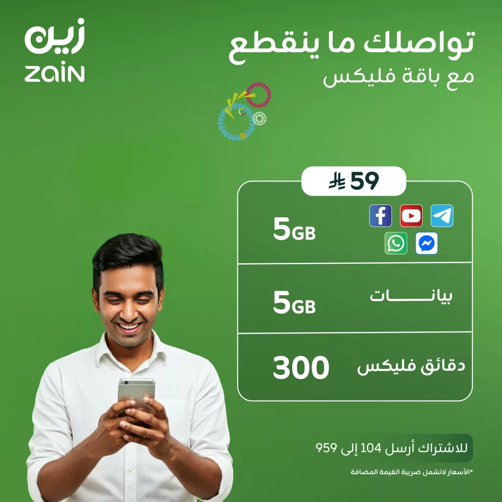 باقة فليكس 59 من زين تمنحك مزايا متعددة مقابل 59 ريال سعودي فقط، وتفاصيل الباقة كالتالي:
