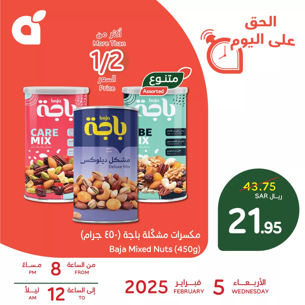 مع استمرار موسم التخفيضات في المملكة العربية السعودية، تقدم بنده واحدة من أروع العروض اليومية على مكسرات باجة (450 جرام). استمتعوا بتجربة فاخرة من المكسرات المتنوعة مع توفير مذهل بأكثر من نصف السعر! هذا العرض متاح لفترة محدودة خلال توقيت معين. تابعوا تفاصيل العرض للاستفادة من الخصومات الرائعة.