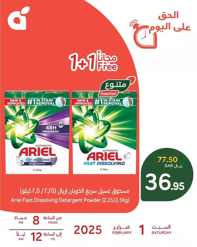 - مسحوق غسيل سريع الذوبان أريال (2.25/2.5 كجم) – السعر: 36.95 ريال سعودي (بدلاً من 77.50 ريال سعودي) – عرض 1+1 مجانًا